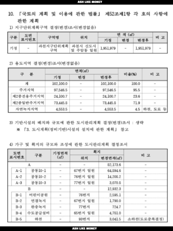 과천주공10단지의 사업면적은 30,939평이며 40평이 35억, 33평이 30평, 27평이 28억 수준이다. 과천주공10단지의 기존 용적률이 100%이므로 기존 연면적은 30,939평이고 용적률이 A-1구역은 217%, A-2구역은 150%로 나눠진다. A-1이 19,664평이고 A-2구역은 4,304평, A-3구역은 930평이므로 총 연면적은 42,670평 + 6,456평 + 1,395평이므로 50,521평이다.