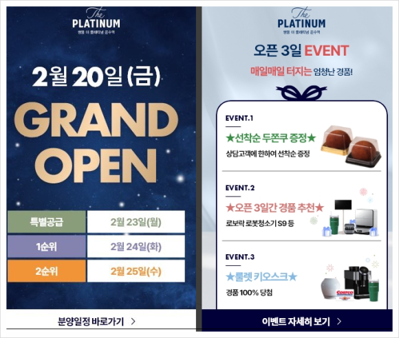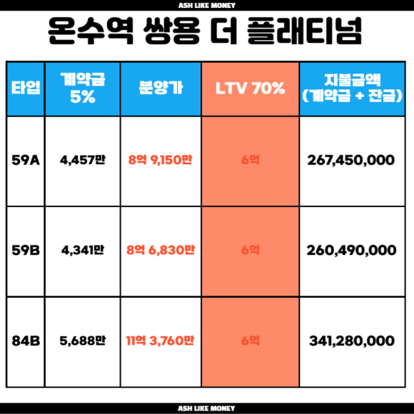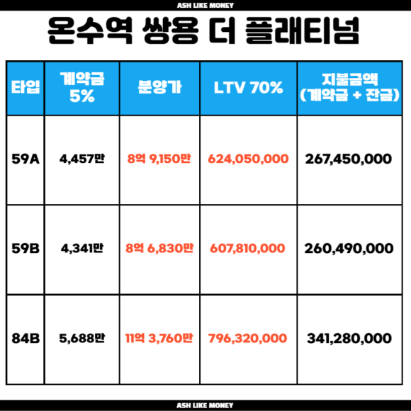전체 세대중 특별공급이 121세대, 일반공급이 109세대이다. 타입 구성은 59A 96세대, 59B 130세대, 84B 4세대이다. 쌍용 더 플래티넘은 중도금 대출이 60%까지 가능하며 이자후불제이다. 발코니확장금액은 59타입은 2,970만원이며 84타입은 3,690만이다. LTV는 70%이지만, 대출규제 때문에 최대 6억까지 제한된다.