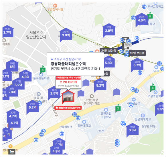 1호선 온수역, 7호선 온수역 더블역세권이며 아쉽게도 초품아는 아니다. 도로교통이 편한데 경인로, 경인고속도로, 서부간선도로, 올림픽대로, 강남순환도시고속도로 등 광역도로망 접근이 용이하다. 커뮤니티로는 피트니스, GX룸, 작은도서관, 어린이집 등이 있다. 향후 GTX-B가 지나가는 곳이지만 2030년 첫삽을 뜰 예정이니 아직 한참 남았다. 또 다른 개발 진행 상황으로는 온수역 럭비구장 개발 건이 있다. 온수역 럭비구장은 주상복합으로 탄생하며 업무시설 및 오피스텔 등이 들어오는 계획이 있다.