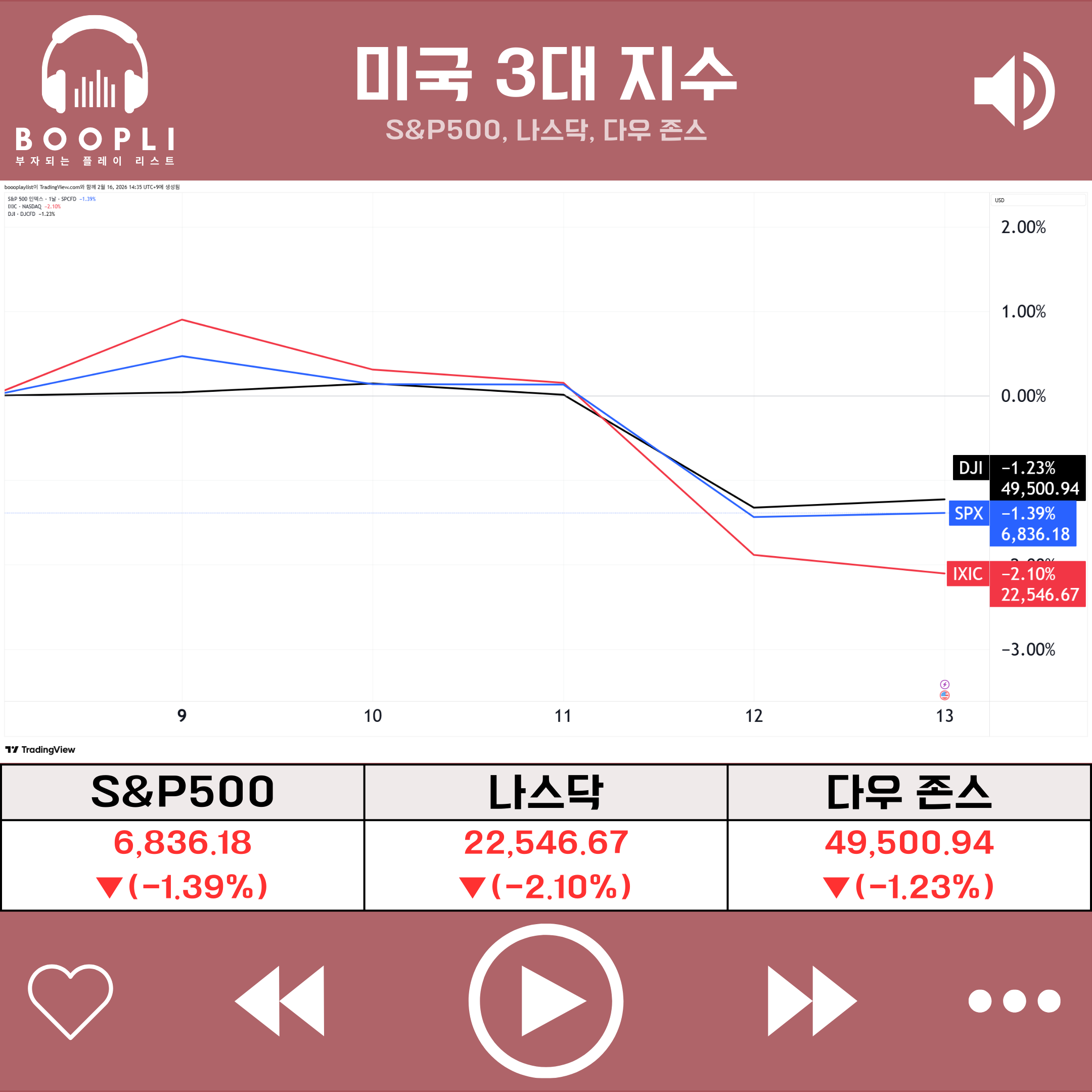 이번 주 미국 증시는 소비·고용·물가 지표가 연이어 발표되는 가운데, 인공지능(AI) 확산에 따른 산업 구조 재편 우려가 부각되며 기술주 중심의 하락 압력이 나타났다.