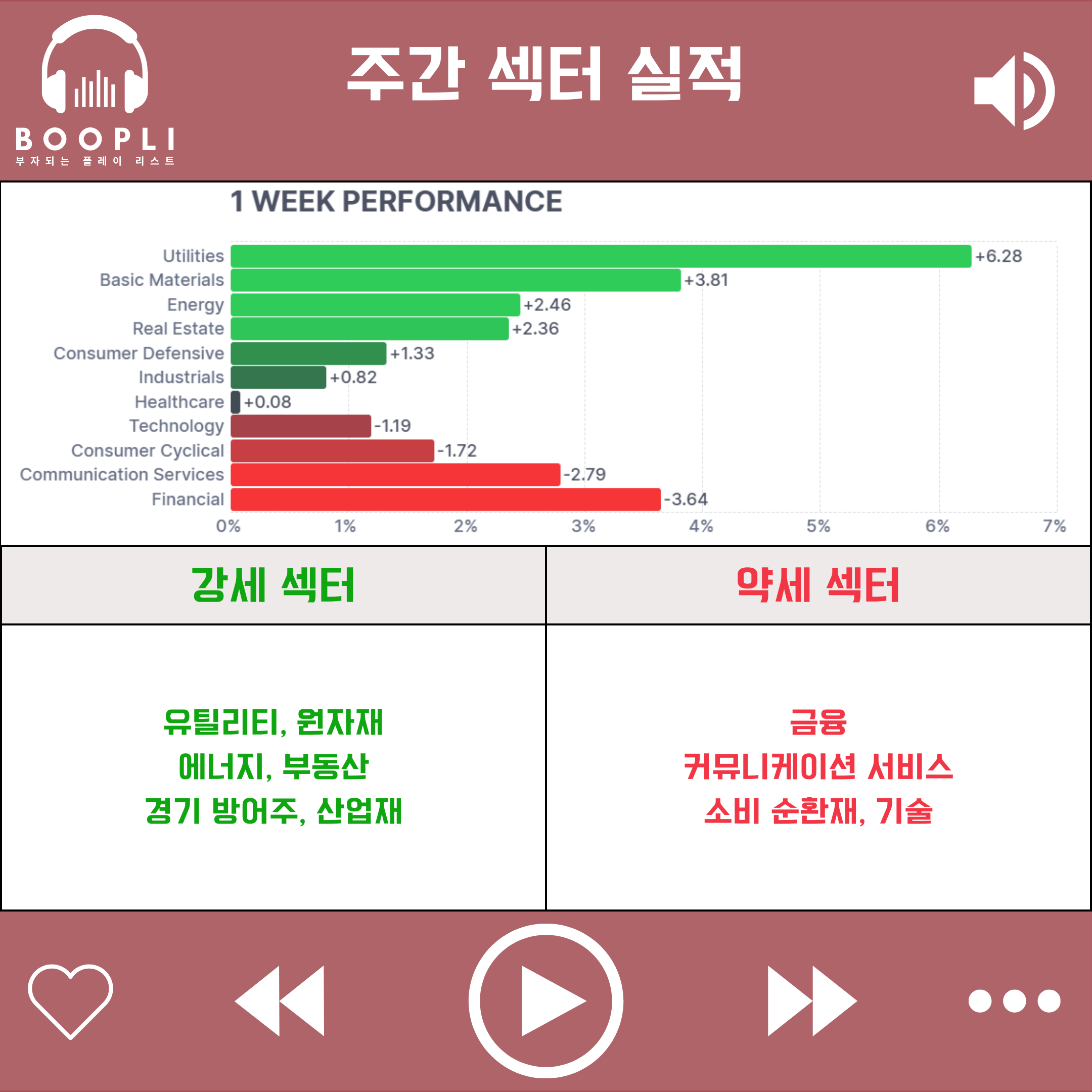 이번 주에는 소비와 고용 지표가 혼재된 가운데 CPI가 둔화되면서 국채 금리가 하락하자 금리에 민감한 유틸리티, 원자재 섹터가 상승을 주도했고, 이어서 에너지, 부동산, 경기 방어주, 산업재 순으로 강세를 보였다.