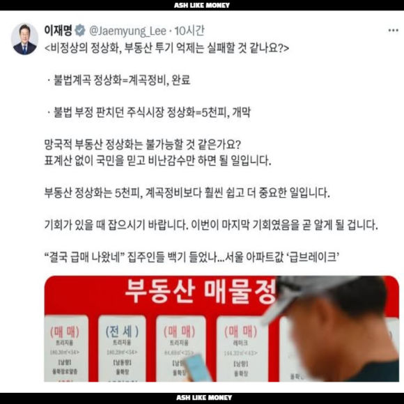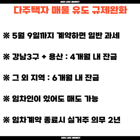 다주택자들에게 중과 유예를 끝내고 버티면 버틸수록 손해보는 세상을 만드려고 한다. 다주택자들에게 최대한 공급을 늘리도록 협박하고 있다. 그래서 5월 9일까지 다주택자들에게 최대한 빨리 매물을 내놓도록 대통령이 직접 X에서 포스팅을 적극적으로 하고 있다.