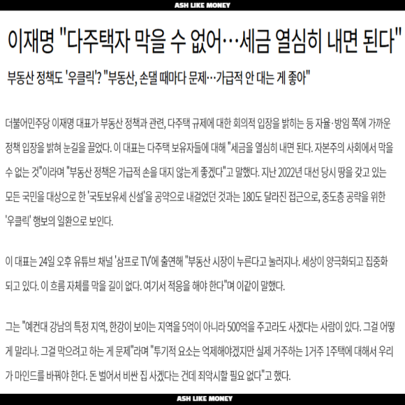 하지만 과거 인터뷰에선 자본주의 사회에서 집 여러 채 들고 있는 것이 무엇이 문제냐라고 말한 적이 있다. 그래서 과거 자신이 한 말과 계속 싸워야 하는 입장이 되었고 대통령 자신조차 분당에 1기 신도시 재건축 물건에 전세를 주고 인천에 전세로 살았다.