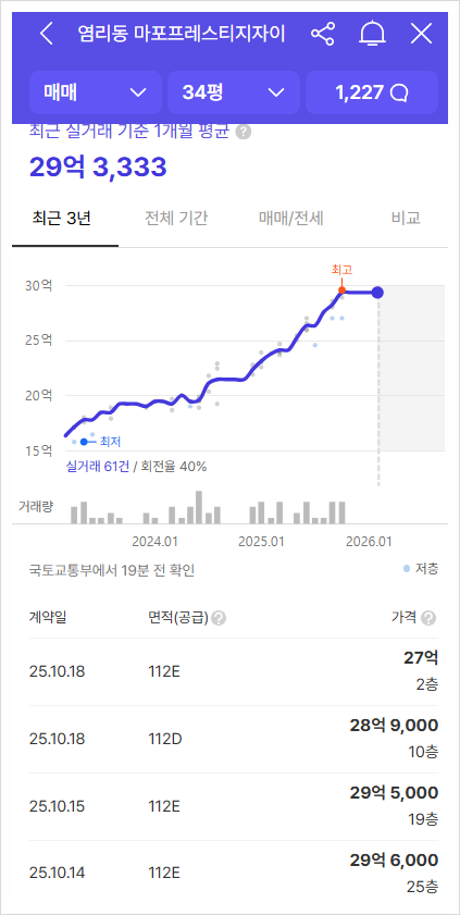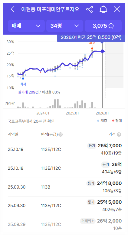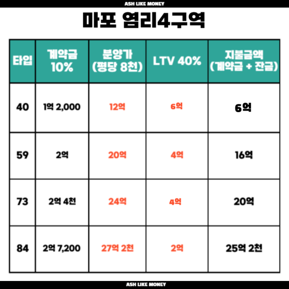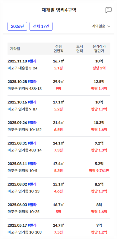 염리4구역 근처 아파트를 살펴보면 14년도 지어진 마포래미안푸르지오, 마포그랑자이, 마포프레스티지자이, 마포자이더센트리지, 마포더클래시 등이 있다. 마포래미안푸르지오는 26년 26억, 마포프레스티지자이는 29억 6천만원, 마포그랑자이는 26억, 마포더클래시는 26억 3천만원에 실거래된 이력이 있고 규제와 함께 전고점을 찍고 있다. 이 근처에 있는 염리4구역 역시 20억을 넘어 30억 클럽에 가입될 가능성이 매우 높은 재개발 구역이다.