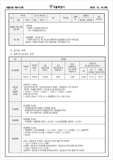기존 용적률을 알 수 없으므로 160~200%로 가정하여 160%로 계산하면 기존 연면적은 17,429평이다. 기준 용적률은 227%, 상한 용적률이 245%, 법적 최대 상한용적률은 300%인데, 245% 상한 용적률을 적용한 연면적은 26,687평이다. 임대주택 40㎡를 기준으로 258세대로 가정하면 3,127평이므로 일반분양 면적은 6,131평이다.