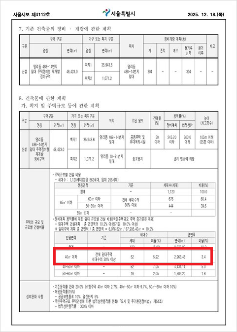 현재 토지등소유자는 668명이고 세대수는 1,120세대로 늘리고 임대는 258세대가 포함된다. 평형구성은 60㎡ 이하가 60%, 60㎡ 초과가 40%이다. 사업면적은 14,673평이고 정비기반시설 면적은 3,456평, 종교시설 324평을 제외한 아파트 면적은 10,893평이다.