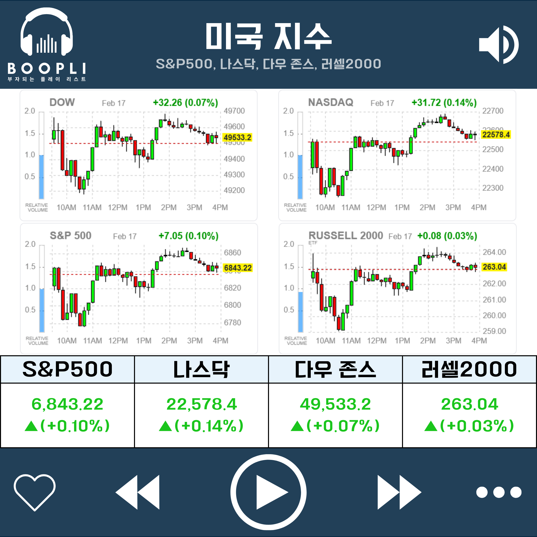 전일 미국 증시는 인공지능(AI)이 산업 전반에 타격을 줄 수 있다는 ‘AI 파괴론’이 지속되며 변동성이 확대됐으나, 대형 기술주를 중심으로 반발 매수세가 유입되며 다우(+0.07%), S&P500(+0.10%), 나스닥(+0.14%), 러셀2000(+0.03%) 등 주요 지수는 모두 강보합 마감