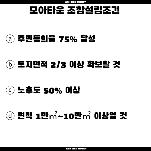 반면, 모아타운은 소규모 빈집법에 속하기 때문에 도정법보다 조합설립조건이 까다롭다. 지금은 동의율이 완화되어 80%에서 75%가 되었지만 문제는 토지확보이다. 토지확보율이 전체의 2/3이란 까다로운 조건을 통과해야 조합설립인가가 된다. 게다가 모아타운은 모아주택이 여러개 모여 구역이 쪼개지기에 통합으로 개발되지 않으면 브랜드 가치 및 사업성이 나오지 않는다.