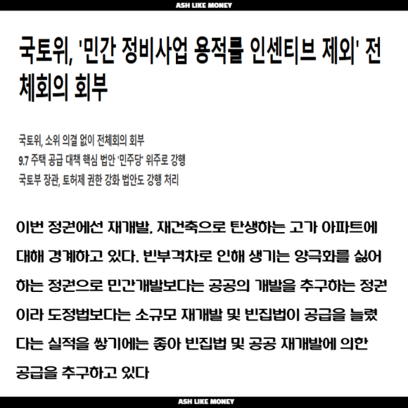 대신, 현재 정권에선 재개발, 재건축에 의한 신축 고가 아파트를 짓는 것을 꺼리기에 소규모 빈집법에 의해 탄생하는 아파트는 자기들 실적을 위해서라도 통합심의 등에서 태클을 걸지 않고 원만하게 통과시키고 있는 추세이다.