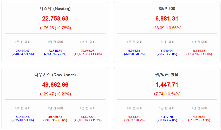 불안한 매크로 환경 속에서도 뉴욕 증시의 주요 지수들은 기술주들의 실적 기대감에 힘입어 견고한 흐름을 유지하며 상승 마감했습니다. 나스닥 지수가 22,753.63포인트를 기록하며 0.78% 상승했고 S&P 500과 다우 지수 역시 각각 0.56%와 0.26% 오르며 강세장의 저력을 보여주었습니다. 종목별로는 엔비디아가 1.63% 상승하고 마이크론이 5.29% 급등하며 반도체 섹터가 지수 상승을 견인했으나 한편으로는 높은 환율이 국내 투자자들에게는 부담이자 기회로 작용하고 있습니다. 원/달러 환율이 1,447.71원까지 치솟으며 환차익을 기대할 수 있는 구조가 형성되었지만 이는 동시에 신규 진입을 고민하는 투자자들에게는 높은 가격 장벽이 되고 있는 상황입니다.
