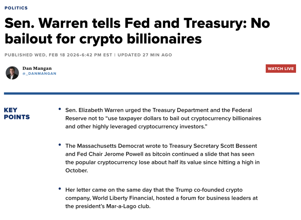 이 상황에서 워런 의원은 재무장관 스콧 베센트(Scott Bessent)와 연준 의장 제롬 파월(Jerome Powell)에게 서한을 보내, 정부가 유동성을 공급해 암호화폐 시장을 떠받치는 일은 해서는 안 된다고 못 박았습니다. 금융위기 때처럼 은행이나 기관에 긴급 자금을 지원하는 권한이 정부에 있는 건 사실이지만, 그걸 비트코인 시장에까지 확장하는 건 전혀 다른 문제라는 입장입니다.