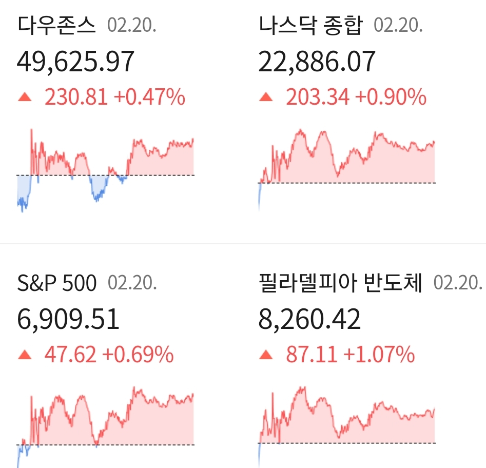 현지 시간 20일 미국 뉴욕 증시는 3대 지수 모수 상승 마감하였습니다. 미국 대법원은 이날 트럼프 대통령의 상혹관세 부과는 위법이라고 판결하였고, 이에 트럼트 대통령은 관세에 대한 정책 경로 수정 방식으로 대안 관세를 부과 하겠다고 예고 하였는데요.