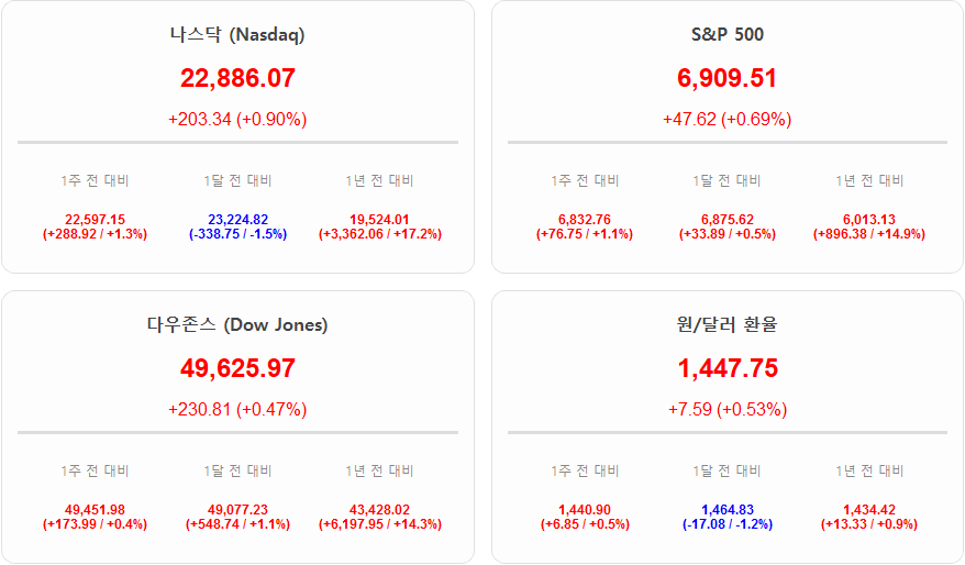 현재 글로벌 시장은 정책적 불확실성과 기술적 경쟁이 교차하며 팽팽한 긴장감이 흐르고 있으며 공포탐욕지수가 43인 공포 단계에 머물러 있는 것은 투자자들의 불안 심리를 고스란히 반영하고 있습니다. 도널드 트럼프 대통령이 대법원 판결에도 불구하고 무역법 122조를 통해 관세 전쟁을 지속하려는 움직임을 보이면서 글로벌 공급망의 변동성은 더욱 확대될 것으로 보입니다. 특히 수입 기업들이 1335억 달러 이상의 관세 환급을 요구하며 법적 투쟁을 예고한 점은 향후 기업 실적과 행정부의 재정 정책에 큰 부담으로 작용할 가능성이 큽니다. 외환 시장에서도 원/달러 환율이 1,447.75원을 기록하며 높은 수준을 유지하고 있어 수입 물가 상승 압력과 더불어 자산 가치 방어를 위한 달러 자산 선호 현상이 뚜렷하게 나타나고 있는 상황입니다.