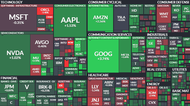 여러 악재와 불확실성 속에서도 지난 밤 미 증시는 기술주들의 견조한 흐름에 힘입어 나스닥 지수가 0.90% 상승하고 S&P 500이 0.69% 오르는 등 반등에 성공했습니다. 증시맵의 면면을 살펴보면 애플이 1.53% 상승하고 엔비디아가 1.02% 오르는 등 AI와 반도체 섹터가 전체적인 상승 분위기를 주도했음을 알 수 있으며 구글과 아마존 역시 각각 3.74%와 2.56%의 높은 상승률을 기록하며 시장의 핵심 축 역할을 했습니다. 중국 AI 기업들의 추격이 거세지고 있음에도 불구하고 여전히 시장은 미국 빅테크 기업들의 압도적인 생태계 장악력과 수익 창출 능력에 더 큰 점수를 주고 있는 모습입니다. 다만 관세 정책의 직접적인 타격을 입을 수 있는 소비재와 제조업 섹터에서는 상대적으로 조심스러운 움직임이 관찰되고 있어 업종별 차별화 장세는 당분간 지속될 것으로 판단됩니다.