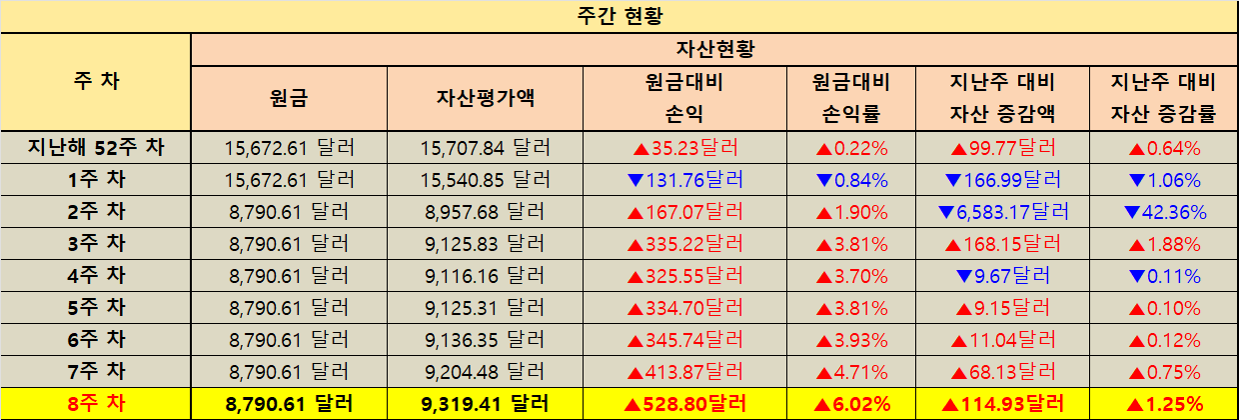 시장이 탐욕에 젖어 있을 때나 공포에 떨고 있을 때나 흔들림 없이 정해진 날짜에 적립식 매수를 집행했던 그 시간들이 모여서 이제는 제 경제적 독립을 위한 든든한 초석이 되어주고 있습니다. 이처럼 자산의 규모가 커질수록 복리의 마법이 자아내는 속도는 더욱 빨라질 것이기에 앞으로 다가올 9주 차와 10주 차의 변화 역시 큰 기대감을 가지고 기다려 보려 합니다. 단순히 숫자의 나열을 넘어 저의 땀과 시간이 녹아있는 이 결과물들이 미래의 저를 더 자유롭게 만들어 줄 것이라 믿어 의심치 않습니다. 이러한 자산 증식의 기록은 저에게 단순한 재테크 이상의 가치를 지니며 매 순간 성실하게 살아가야 할 이유를 제공해 줍니다.