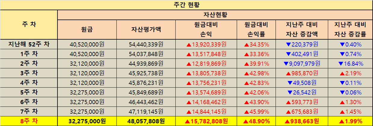 이번 8주 차의 전체 자산 현황을 면밀히 분석해 보면 지난주와 비교했을 때 무려 938,663원이 증가하며 약 1.99%의 눈부신 성장을 기록했습니다. 원금 대비 총 손익은 15,782,808원이라는 경이로운 숫자에 도달했으며 전체 수익률 또한 48.90%라는 압도적인 수치를 달성하며 우상향의 정석을 보여주었습니다. 일주일 만에 거의 백만 원에 가까운 자산이 늘어나는 과정을 지켜보면서 자본이 스스로 일하게 만드는 시스템의 위대함을 다시 한번 뼈저리게 느끼게 됩니다. 특히 전체 자산 평가액이 48,057,808원에 안착하며 이제는 5,000만 원 고지를 눈앞에 두게 되었는데 이는 단순히 운이 좋아서 거둔 성과가 아니라 시장의 파도 속에서도 묵묵히 노를 저어온 인내의 결과물이라 생각합니다.