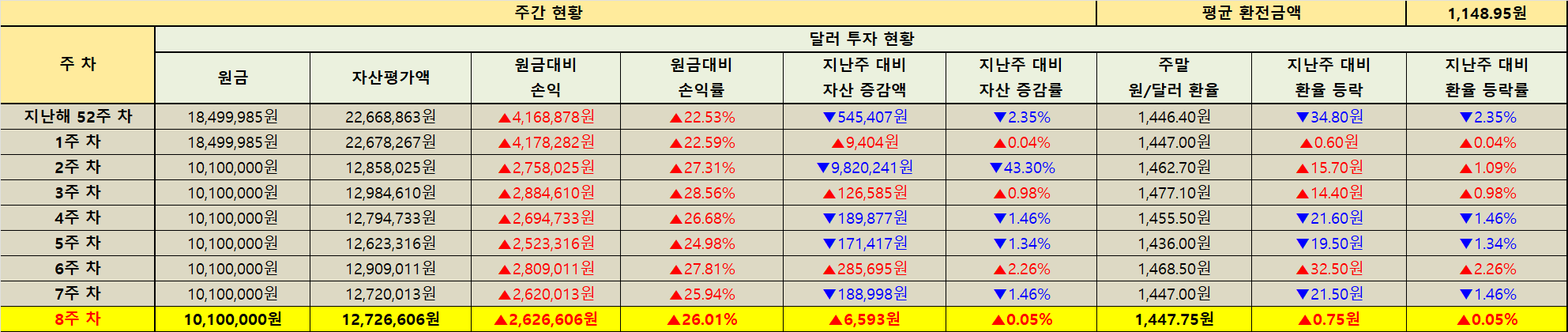 미국 주식 직투 계좌의 성과 역시 이번 주 투자자들을 미소 짓게 만든 주역이었는데 원화 기준으로 173,293원이 증가하며 1.30%의 수익을 기록했고 달러 기준으로는 114.93 달러가 늘어나며 1.25%의 상승을 나타냈습니다. 최근 미국 증시의 기술주 섹터가 인공지능 산업의 성장에 힘입어 견조한 흐름을 유지한 덕분에 제 계좌의 평가액 또한 자연스럽게 우상향 곡선을 그릴 수 있었네요. 여기에 더해 원/달러 환율이 1,447.75원으로 지난주 대비 0.75원 상승하며 원화 환산 가치를 한층 더 끌어올리는 긍정적인 '환차익 효과'까지 더해졌습니다. 평균 환전 금액인 1,148.95원과 비교해 보면 현재의 환율은 상당히 높은 수준이지만 이는 달러 자산을 보유함으로써 얻는 일종의 보험금과 같은 성격을 지닌다고 생각합니다.