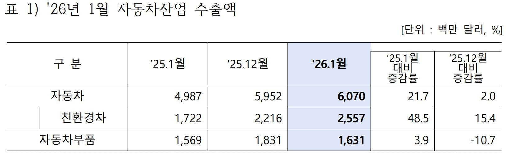 2026년 1월 자동차수출 60.7억불, 역대 1월 중 2위