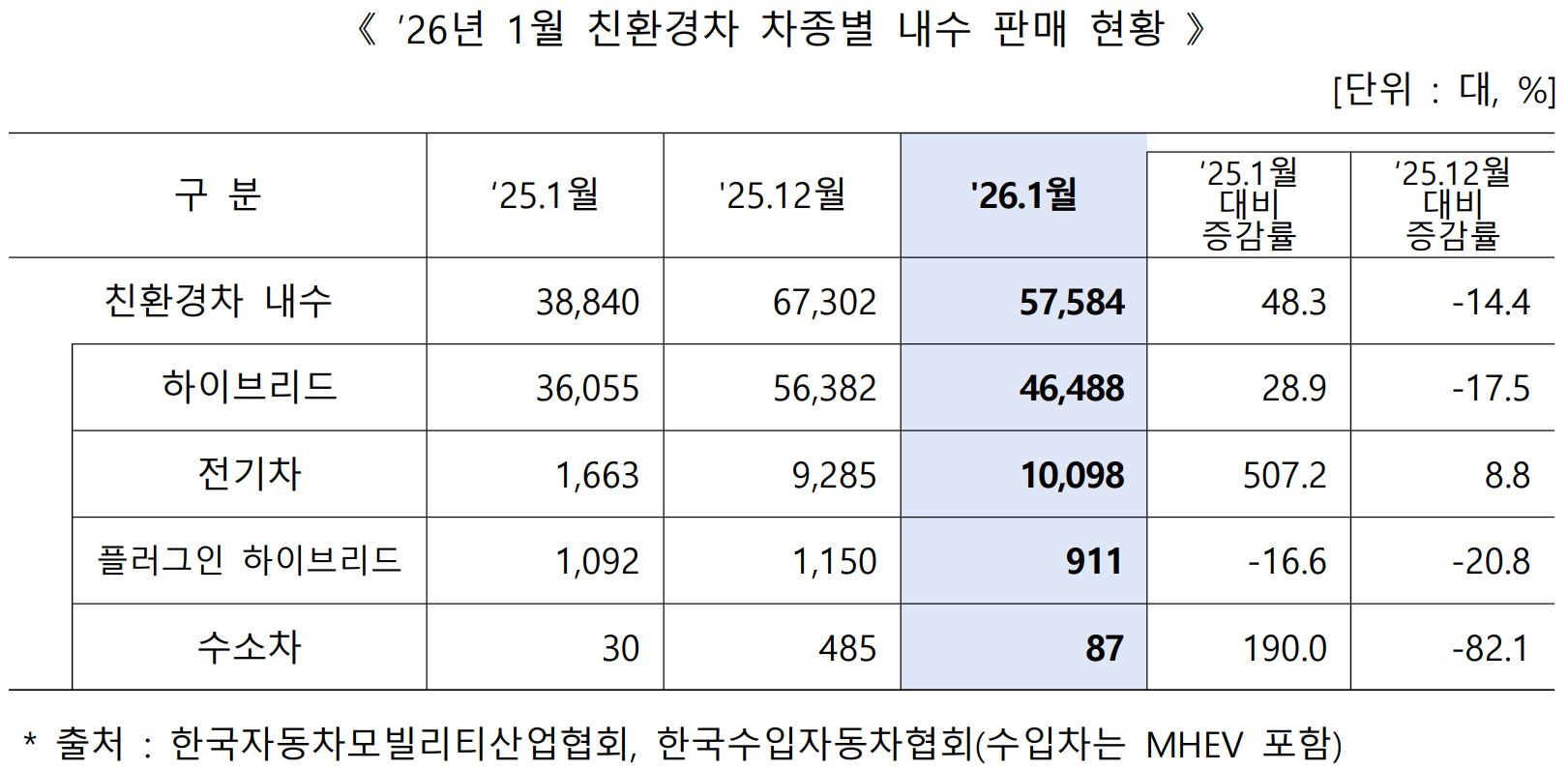 ㅇ 26년 1월 친환경차 내수 판매량은 57,584대(전년동월비 +48.3%)