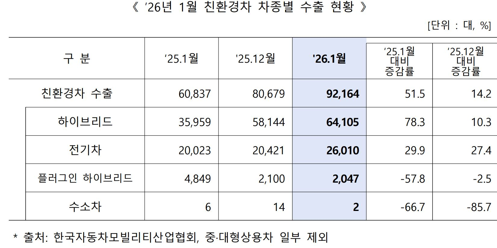 ㅇ 26년 1월 친환경차 수출 대수는 92,164대(전년동월비 +51.5%), 수출 금액은 25.6억 달러(전년동월비 +48.5%)