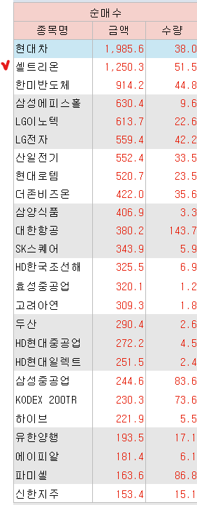 매도 : 코스모신소재 빙그레 현대차2우B 삼성전자(+154.45%) 대원전선(+55.32%) 미래에셋증권(+30.50%) 이수페타시스 HD한국조선해양 삼성에피스홀딩스 풀무원 우리기술(+107.72%) LG디스플레이 현대로템 현대글로비스 SK이노베이션 알테오젠 LK삼양(+59.16%) 한화시스템 엘앤씨바이오 SK바이오팜 루닛 성일하이텍 대한조선 PLUSK방산 아이씨티케이