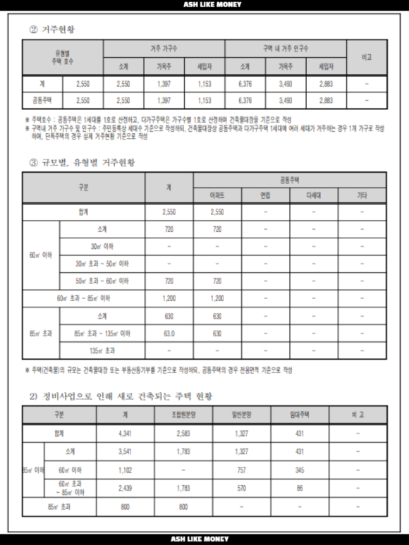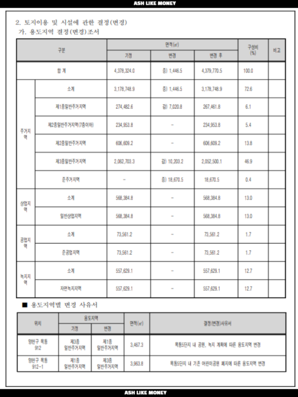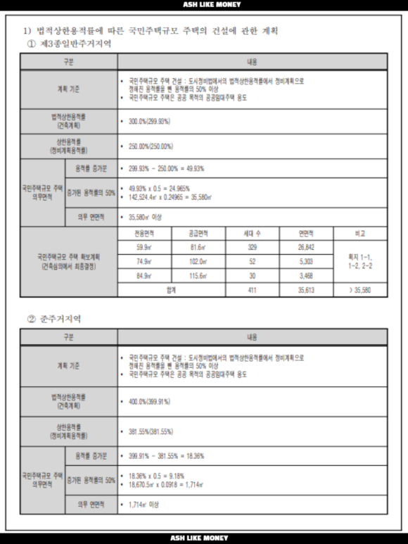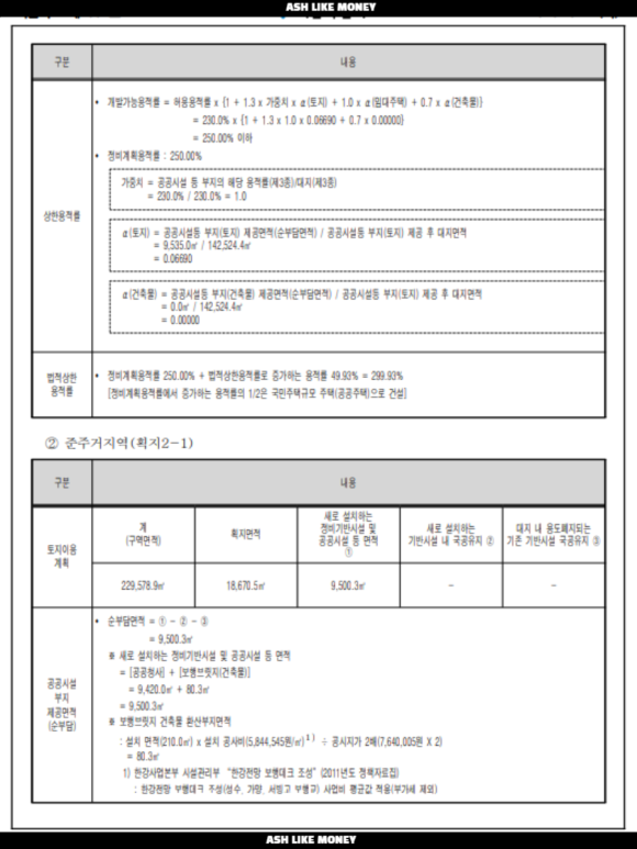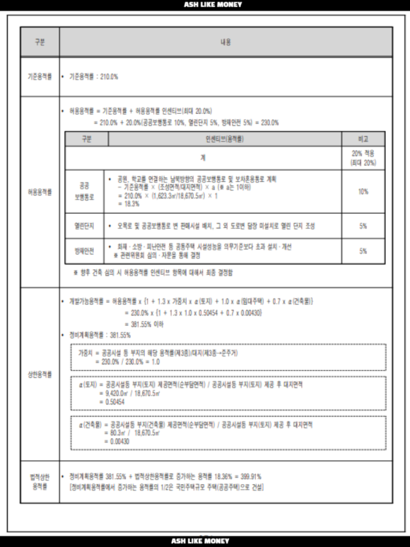 전체 택지는 48,846평이고 도로는 7,271평, 녹지면적은 1,197평, 공공공지는 3,328평, 정비기반시설이 5,954평이므로 아파트 면적은 31,096평이다. 기본 용적률이 125%이므로 기존 연면적은 38,870평이고 8%를 준주거지역으로 최대 400%, 92%를 3종일반주거지역으로 300%를 적용한 연면적은 85,824평 + 9,950평이므로 95,774평이다. 이 중 상가 5천평, 임대주택 비율을 15%로 잡고 14,366평으로 가정하면 일반분양 면적은 37,538평이다.