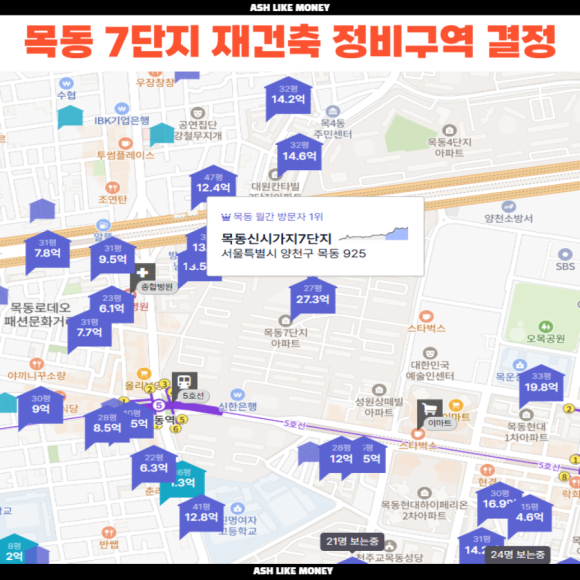 목동7단지는 재건축 진행이 확정되자마자 이제는 평당 1억 수준의 실거래가 완료되었다. 27평이 27억인 수준인데, 목동7단지는 1986년 준공, 2,550세대, 용적률 125%라 사업성도 매우 좋을 것으로 기대된다. 현대백화점, 교보문고, 행복한백화점 등 목동 핵심 상업시설과 모두 가깝고 5호선 목동역 초역세권이기도 하다.