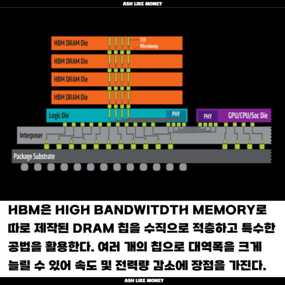이 중 가격 비싼 메모리 반도체는 HBM이다. HBM은 High Bandwidth Memory로 이름대로 대역폭이 높다. 대역폭은 직관적이지 않을 수 있지만 속도와 직결되는 메모리로 "메모리에서 한 번에 빼낼 수 있는 데이터의 양"이 높은 반도체가 HBM이다. 따로 제조된 DRAM칩을 수직으로 여러 개 적층하고 특수한 공법을 통해 칩을 관통하는 전극을 생성하여 제작한다. 기존 32BIT 밖에 되지 않는 대역폭이 여러 개를 적층하여 대역폭을 1024BIT로 늘릴 수 있는 것이 HBM이다.