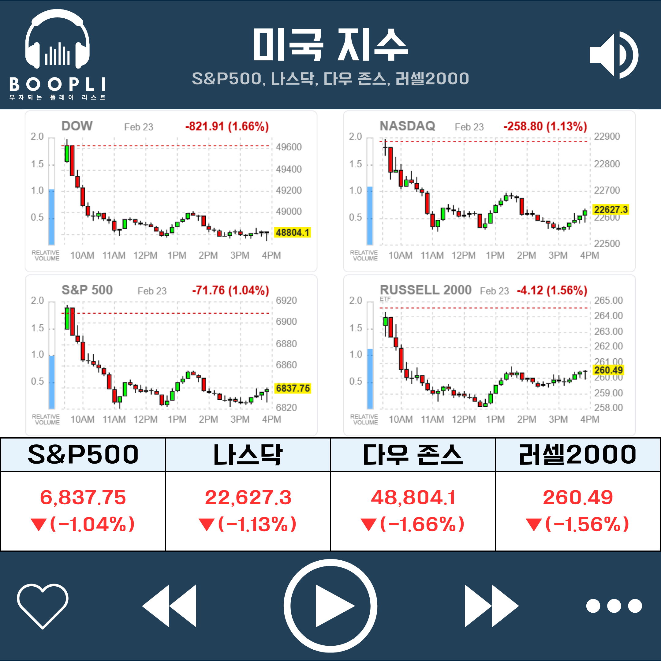 전일 미국 증시는 관세 정책 불확실성 확대와 AI발 산업 구조 훼손 우려, 사모신용 리스크 재부각이 복합적으로 작용하며 다우(-1.66%), S&P500(-1.04%), 나스닥(-1.13%), 러셀2000(-1.56%) 등 주요 지수 모두 하락 마감