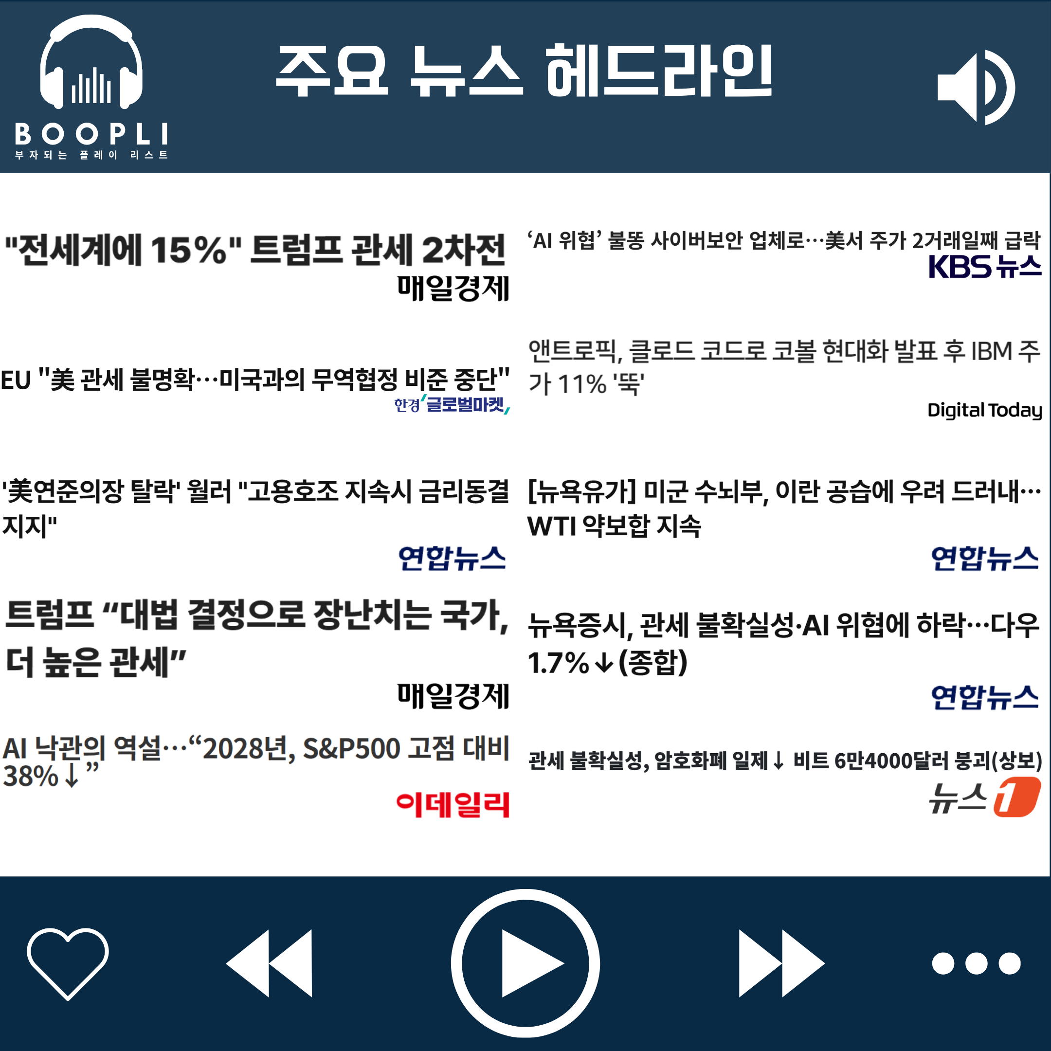 종합하면 전일 시장은 관세를 둘러싼 정책·외교적 불확실성과 AI 확산이 기존 산업의 수익 구조 및 신용시장에 미칠 충격 가능성이 동시에 가격에 반영됨