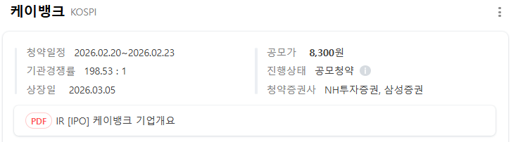 이전 상장시도 할때는 5~6조원의 기업 가치를 기대하기도 했으나, 케이뱅크는 기관 투자자들의 수요예측 결과를 겸허히 수용하여 공모가를 희망 범위 하단인 8,300원, 시총 3.4조원으로 확정했습니다. 개인적으로 요즘 은행주 분위기에서 더 높은 평가를 받을 수 있을거 같아서 아쉽기는 하지만 상장 직후 '오버행(잠재적 매도 물량)' 부담을 줄이고 상장 후 주가 우상향을 도모하기 위한 전략으로 볼 수도 있을거 같습니다.