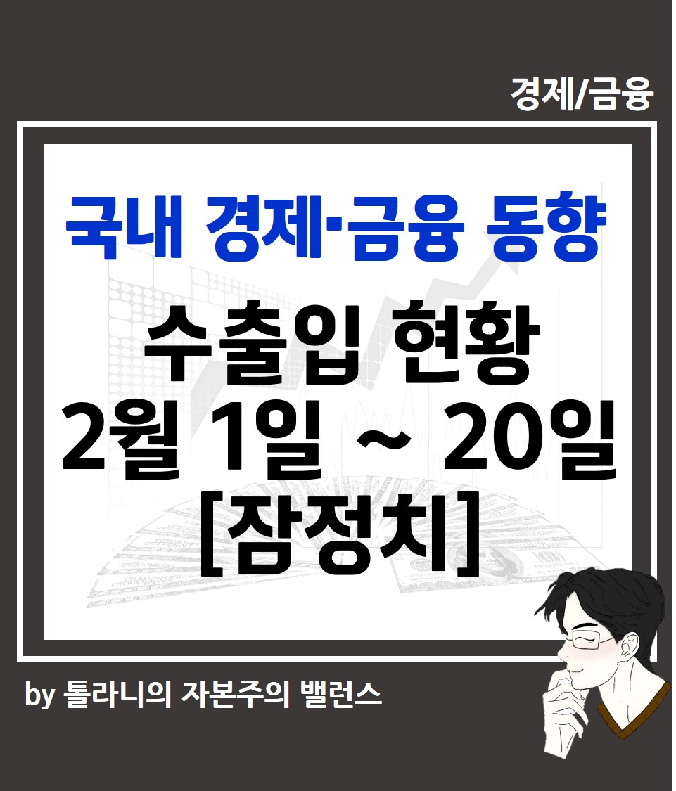 관세청은 2월 1일 ~ 20일 기간의 수출입 현황 잠정치를 발표하였습니다. 수출 및 수입 모두 전년동기대비 증가하였으며, 무역수지는 흑자를 기록했다고 밝혔는데요.