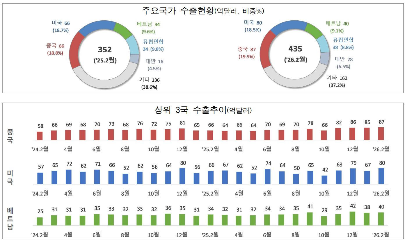 중국(38.6%), 유럽연합(10.5%), 베트남(32.4%), 대만(8.5%) 등 증가, 미국(△3.2%) 등 감소