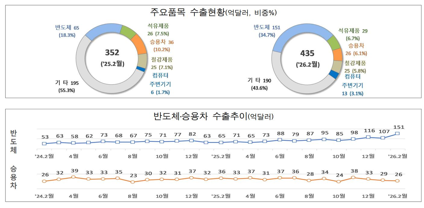 수출 435억 달러, 수입 386억 달러로 전년동기대비 수출 23.5%(82.9억 달러↑) 증가, 수입 11.7%(40.3억 달러↑) 증가