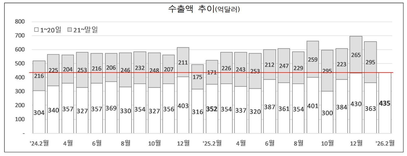 동기간(1~20일) 수출실적 역대최대(2위 ’25.12월 430억 달러)