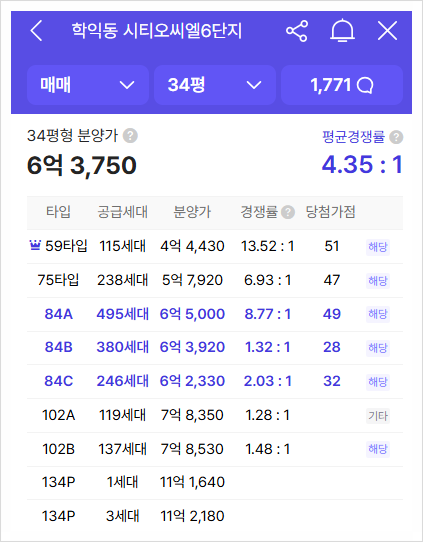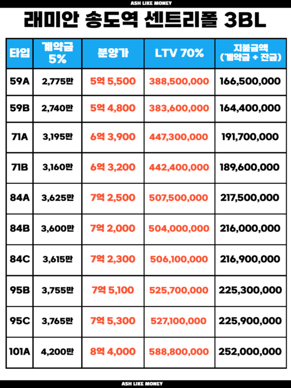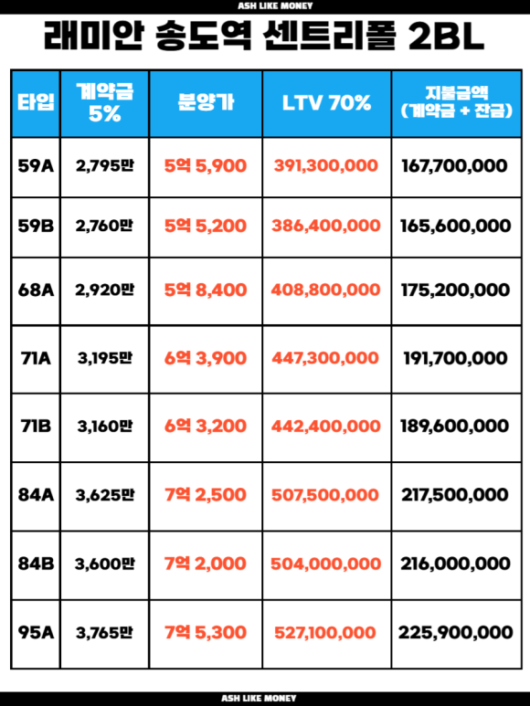 평당 2,100만원으로 계약금은 5%, 중도금 60%, 이자 후불제이며 잔금 35%이다. 근처 시티오씨엘보다 분양가가 좀 더 비싸게 나왔다.