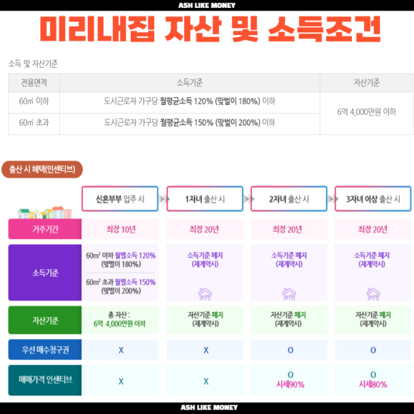 소득 및 자산기준으로 도시근로자 60㎡ 이하의 경우 "월평균소득 120%(맞벌이 180%) 이하, 60㎡ 초과의 경우 "월평균 소득 150%(맞벌이 200%) 이하"이다. 자산 기준으로는 6억 4,000만원 이하여야 한다. 자녀 출산시에는 재계약 시 자산기준이 폐지된다.