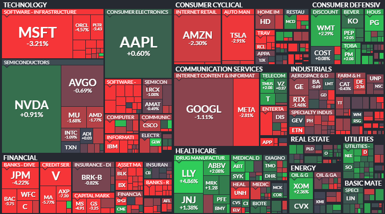 섹터별 흐름을 보면 기술주와 금융주가 지수 하락의 직격탄을 맞은 가운데 헬스케어와 에너지 섹터가 그나마 방어적인 역할을 수행했습니다. 마이크로소프트와 아마존 그리고 메타 같은 빅테크 기업들이 줄줄이 하락하며 시장 분위기를 무겁게 만들었고 특히 금융주들은 제이미 다이먼 회장의 경고가 기폭제가 되어 JP모건을 포함한 대형 은행주들이 일제히 약세를 보였습니다. 반도체 분야에서는 AMD의 대형 계약 소식에도 불구하고 전반적인 기술주 매도세에 휘말려 하락하는 모습을 보였지만 엔비디아는 상대적으로 견조한 흐름을 유지하며 대장주로서의 면모를 지켰습니다. 반면 경기 방어적 성격이 강한 제약주인 일라이 릴리와 에너지 기업인 엑손 모빌 등은 상승세를 기록하며 하락장 속에서도 자산 배분의 중요성을 다시금 일깨워 주었습니다.