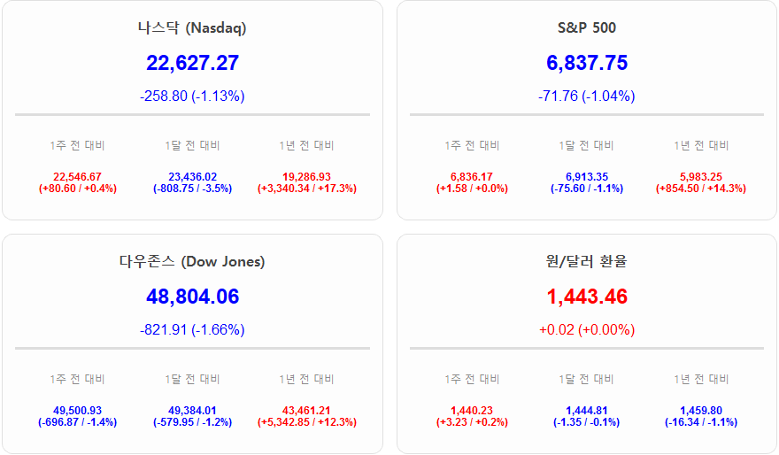 뉴욕 증시는 전반적으로 하방 압력을 강하게 받으며 투자 심리가 크게 위축된 하루를 보냈습니다. 다우 지수는 1.6%가 넘는 급락세를 보였고 나스닥과 S&P 500 역시 1% 이상의 하락률을 기록하며 시장에 퍼진 불안감을 그대로 반영했습니다. 원/달러 환율은 1,443원대라는 높은 수준에서 고착화되는 양상을 보이고 있어 수입 물가 상승에 대한 우려를 키우고 있습니다. 무엇보다 공포와 탐욕 지수가 37포인트를 기록하며 공포 단계로 진입했다는 점은 투자자들이 위험 자산에서 발을 빼고 안전한 곳을 찾으려는 움직임이 뚜렷해졌음을 의미합니다. 소비자 신뢰지수가 10년 만에 최저치로 떨어진 점과 주택 매매 시장의 침체 소식은 앞으로의 경기 전망을 더욱 어둡게 만들고 있습니다.