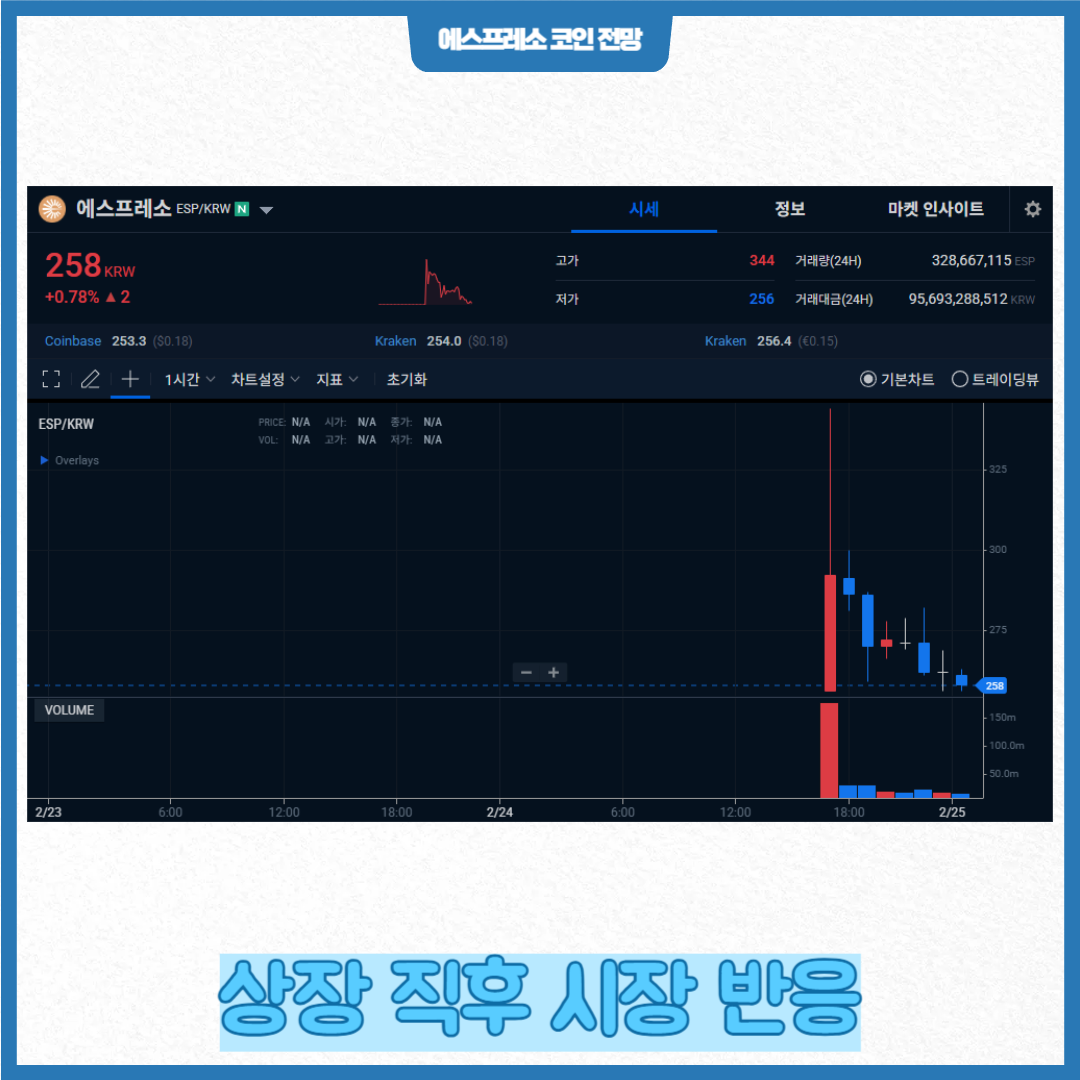 에스프레소가 업비트에 상장된 직후 가격은 거래 대금이 크게 증가하면서 단기 상승세를 보였습니다. 상장 당일 일부 시장 데이터에서는 24시간 동안 60% 이상 상승하기도 했다는 보도가 나올 정도로 시장 관심이 높았습니다.