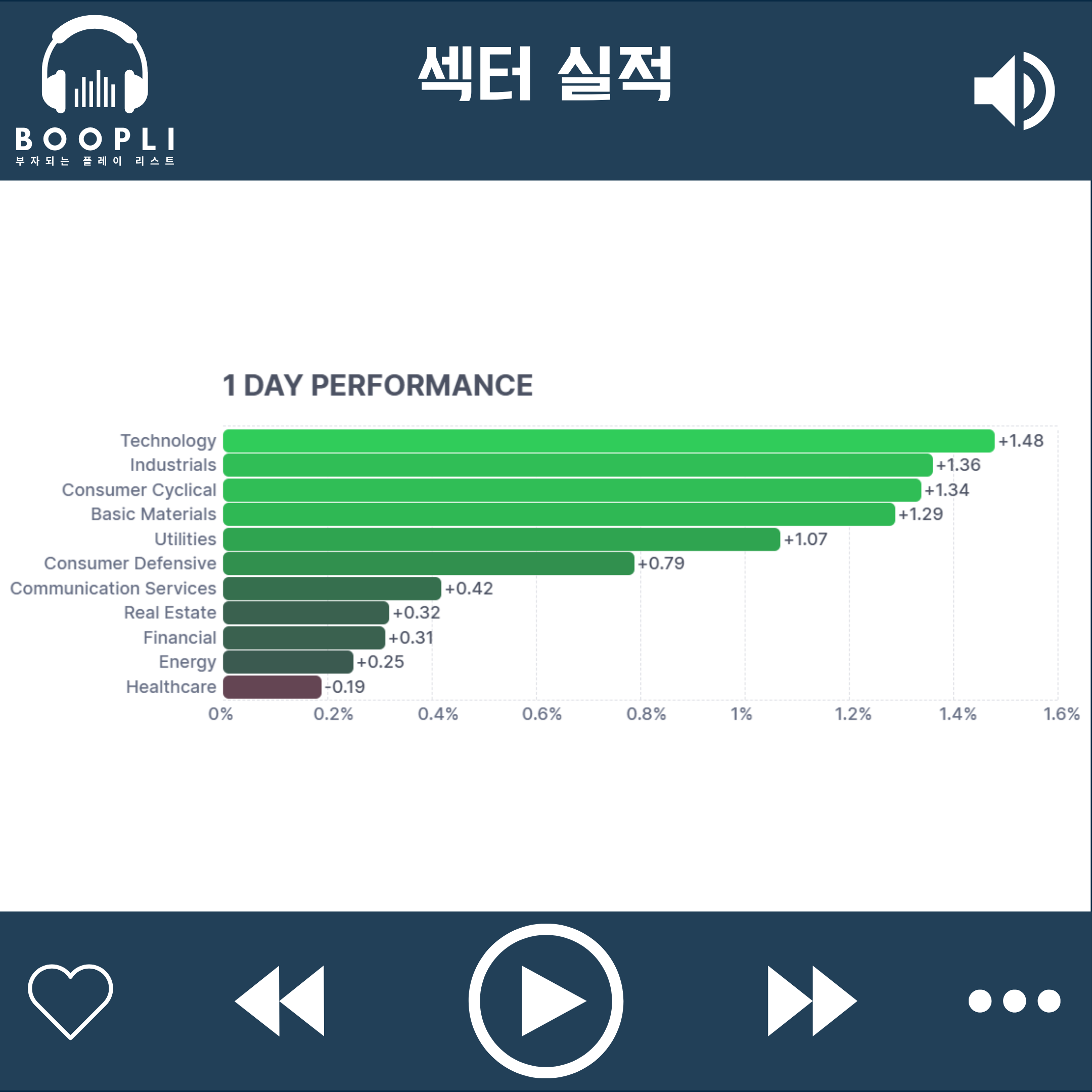 커뮤니케이션 서비스, 부동산, 금융, 에너지 섹터는 강보합, 헬스케어 섹터는 약보합 마감