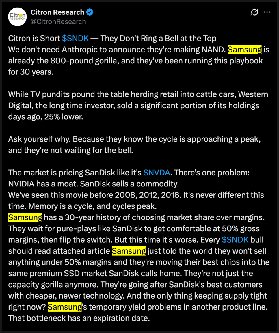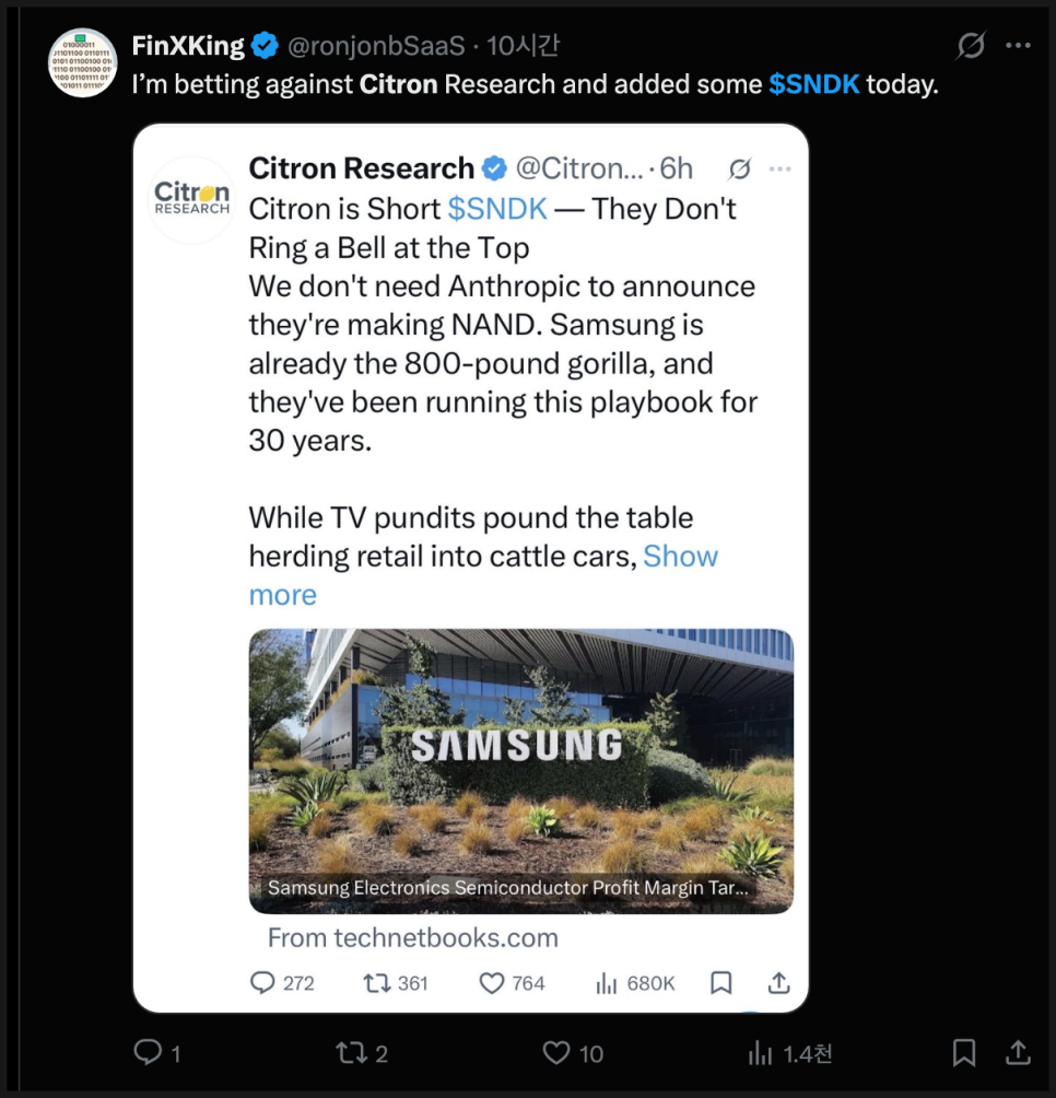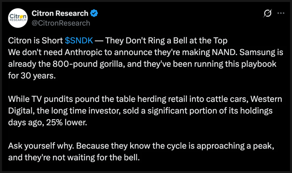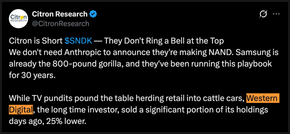 공매도 전문 리서치 회사인 시트론 리서치(Citron Research)가 샌디스크(SanDisk) 주식을 공매도하겠다고 공개적으로 밝혔습니다.