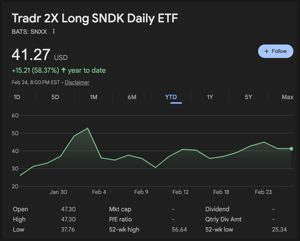 참고로 TRADR 샌디스크 2배 레버리지 ETF 상품은 나온지 이제 한 달 됐는데 수익률이 58%입니다.