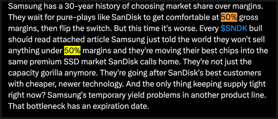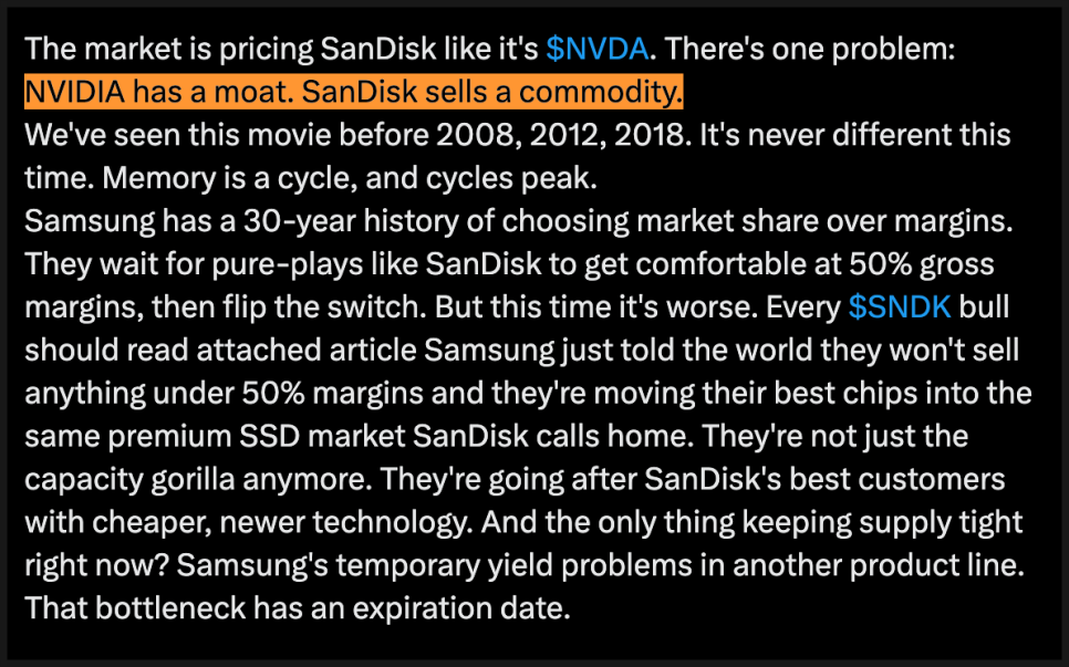 “시장은 샌디스크를 엔비디아(NVIDIA)처럼 가격을 매기고 있다. 하지만 엔비디아에는 해자가 있다. 샌디스크는 원자재를 판다.”