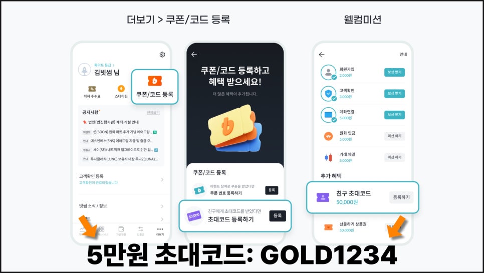 빗썸 앱을 설치하고 회원가입을 완료한 뒤, 쿠폰 코드 등록 메뉴에서 친구 초대코드 GOLD1234를 입력하면 됩니다. 초대코드를 입력해야 5만 원이 지급되며, 전체 과정은 10분 내외로 끝납니다.