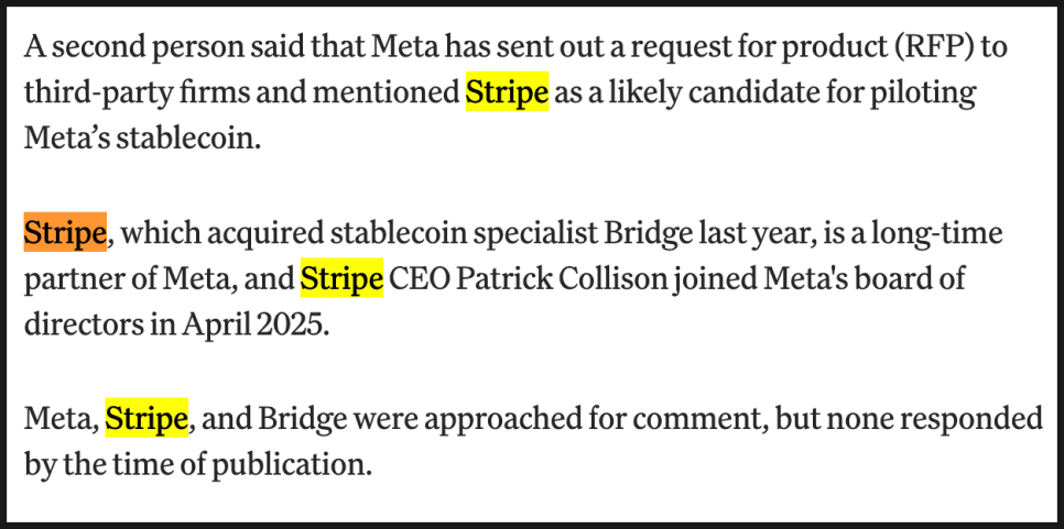 후보로 거론된 곳이 스트라이프(Stripe)입니다. 스트라이프는 지난해 스테이블코인 전문 기업 브리지(Bridge)를 인수했고, 메타와 오랜 파트너 관계를 유지해왔습니다. 게다가 스트라이프 최고경영자 패트릭 콜리슨은 2025년 4월부터 메타 이사회에 합류한 상태입니다. 단순 협력 이상의 연결고리가 있다는 의미죠.