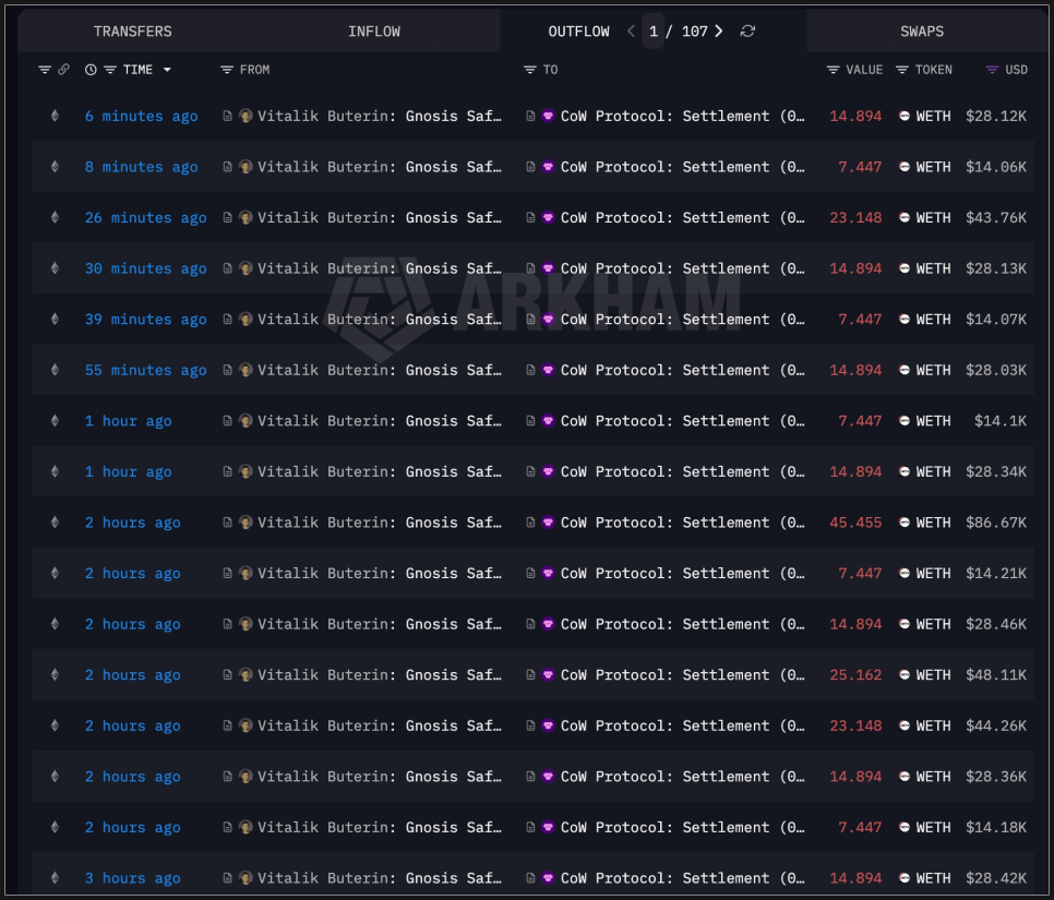 흥미로운 점은 매도 방식입니다. 그는 코우 프로토콜(CoW Protocol)이라는 탈중앙화 거래 집계 플랫폼을 통해 여러 번에 나눠 소규모로 매도했습니다. 대량 한 번에 던지는 방식이 아니라, 슬리피지를 줄이기 위한 전형적인 분할 매도 전략이죠. 시장 충격을 최소화하려는 의도로 보입니다.