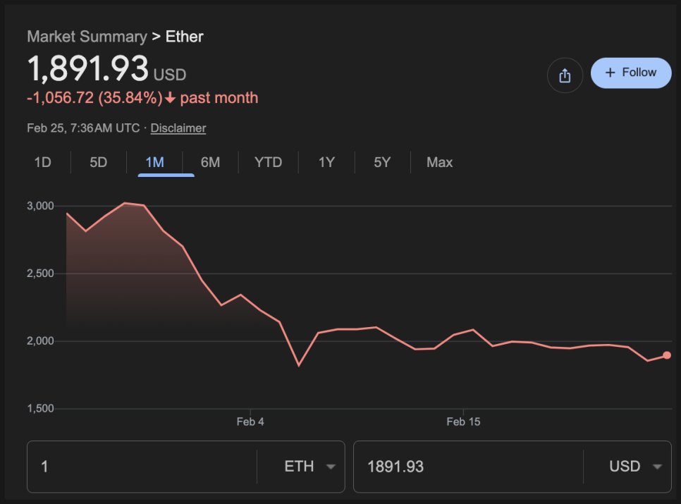 타이밍도 좋다고 보긴 어렵습니다. 이더 가격은 지난 한 달 동안 약 37% 하락해 현재 1,900달러 부근에서 거래되고 있습니다. 사상 최고가 대비 낙폭은 더 큽니다. 이미 방향성을 잃고 흔들리던 시장에 창업자 매도 뉴스가 겹치면서 헤드라인 부담이 더해진 셈입니다.