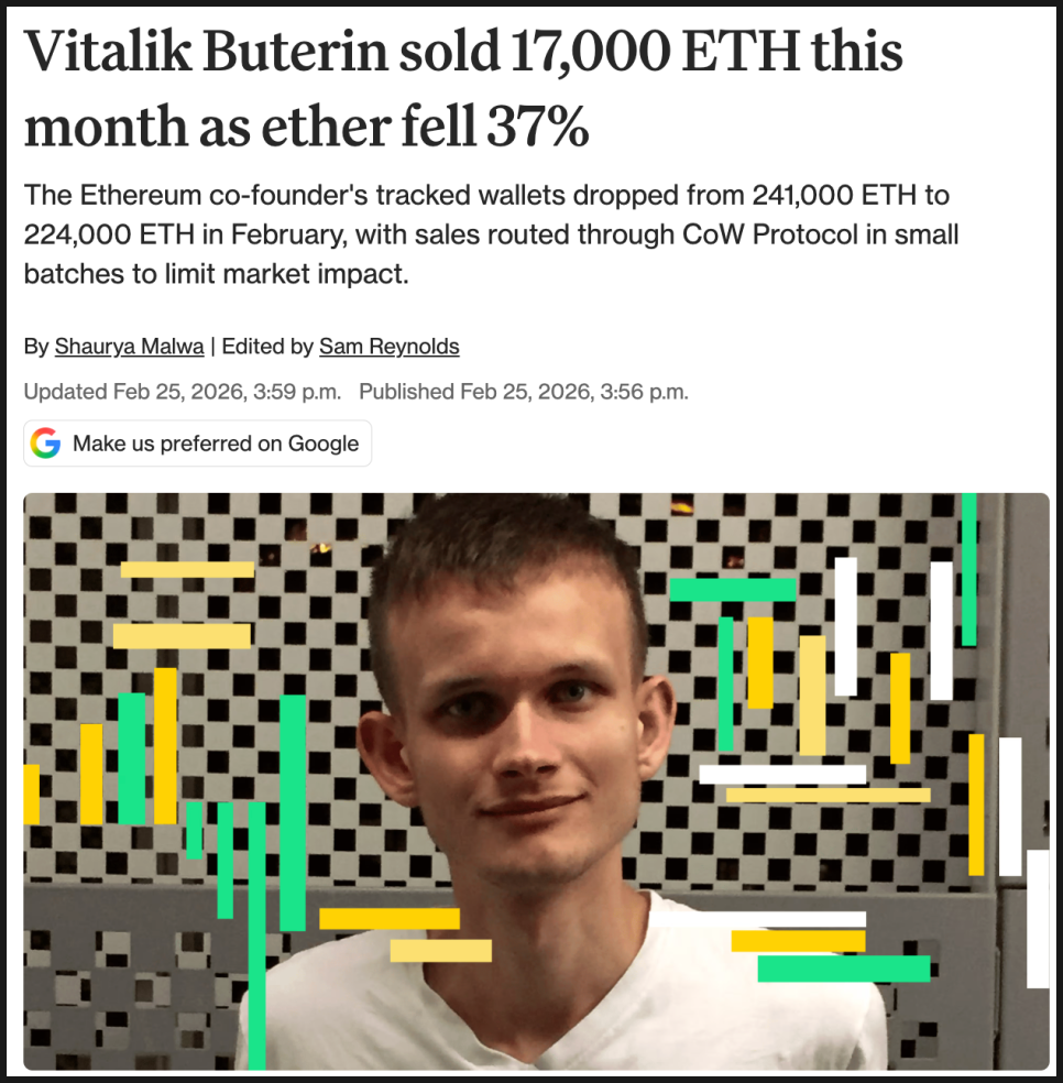 금액으로는 약 4천3백만 달러 규모입니다. 아캄 인텔리전스(Arkham Intelligence) 데이터에 따르면, 부테린과 연결된 지갑의 보유량은 2월 초 약 24만1천 이더에서 현재 22만4천 이더 수준으로 감소했습니다. 초반 며칠 동안 660만 달러어치를, 최근 며칠 사이에도 약 700만 달러 상당을 매도한 것으로 추정됩니다.