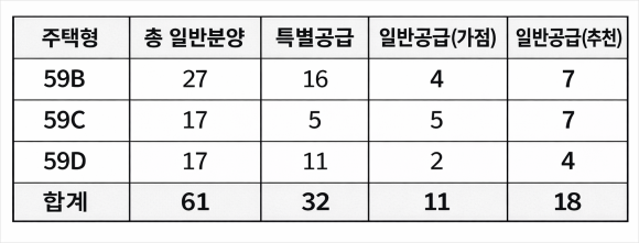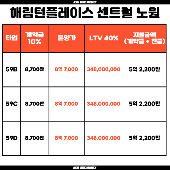1개 동으로 이루어져 아쉽다. 입지는 괜찮지만, 비슷한 노원포레나나 노원센트럴푸르지오 같은 대단지 브랜드 아파트 같은 안전마진을 얻기는 힘들어보인다. 평형 종류는 59B, 59C, 59D로 각각 27세대, 17세대, 17세대이다. 전용 60㎡ 이하 소형평수는 가점제 40%, 추첨제 60%가 적용된다. 일반공급 29세대 중 18세대가 추첨제이다.